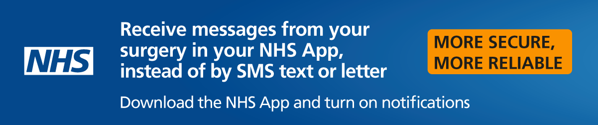 Sign up to the NHS app to request your repeat prescription online or to book appointments. Switch on notifications to receive text messages securely from the surgery.